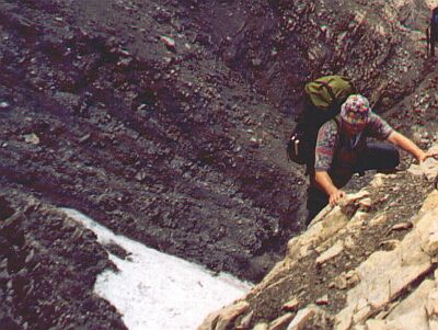 herrscht akute Steinschlaggefahr; ohne den schützenden